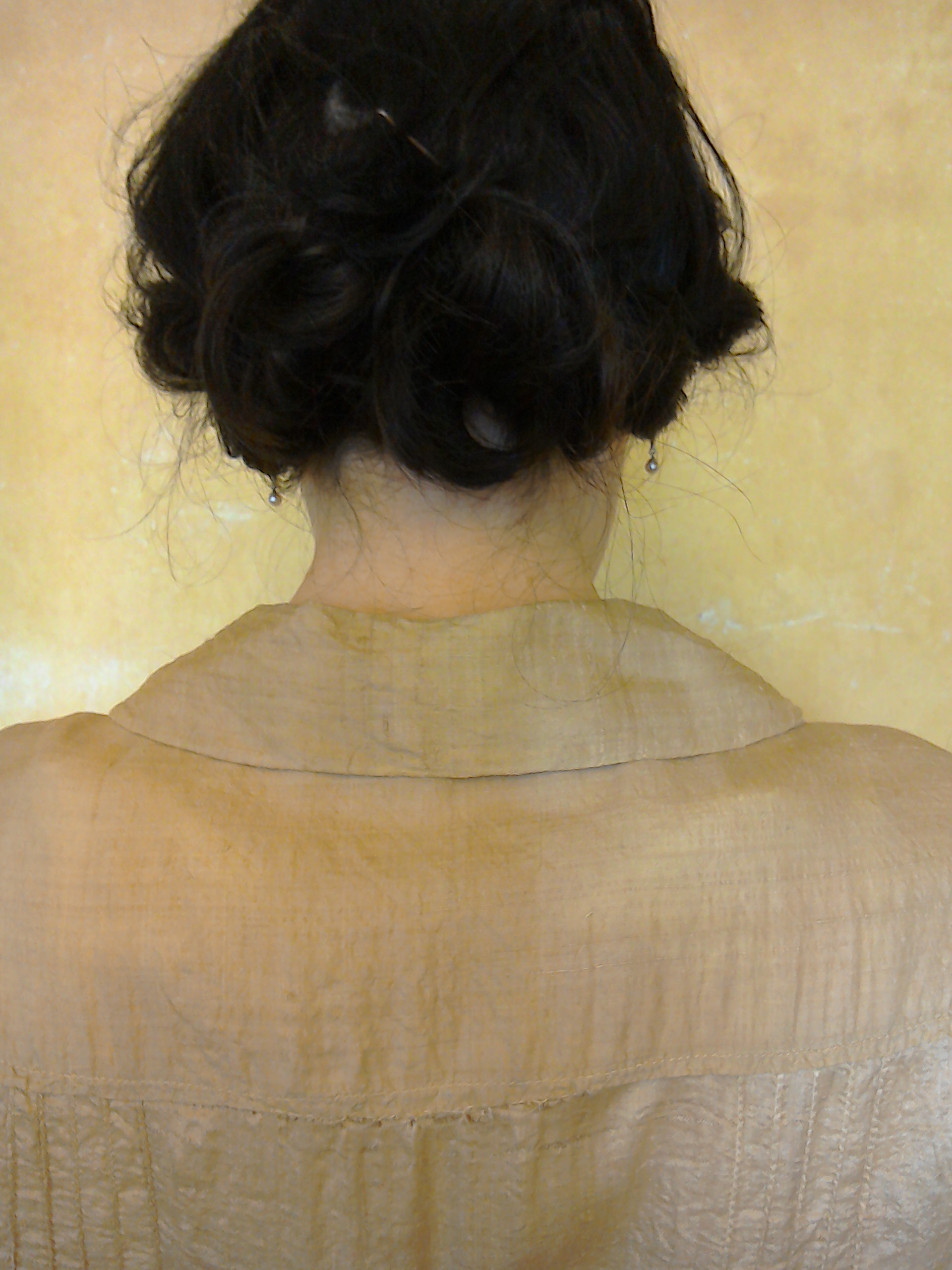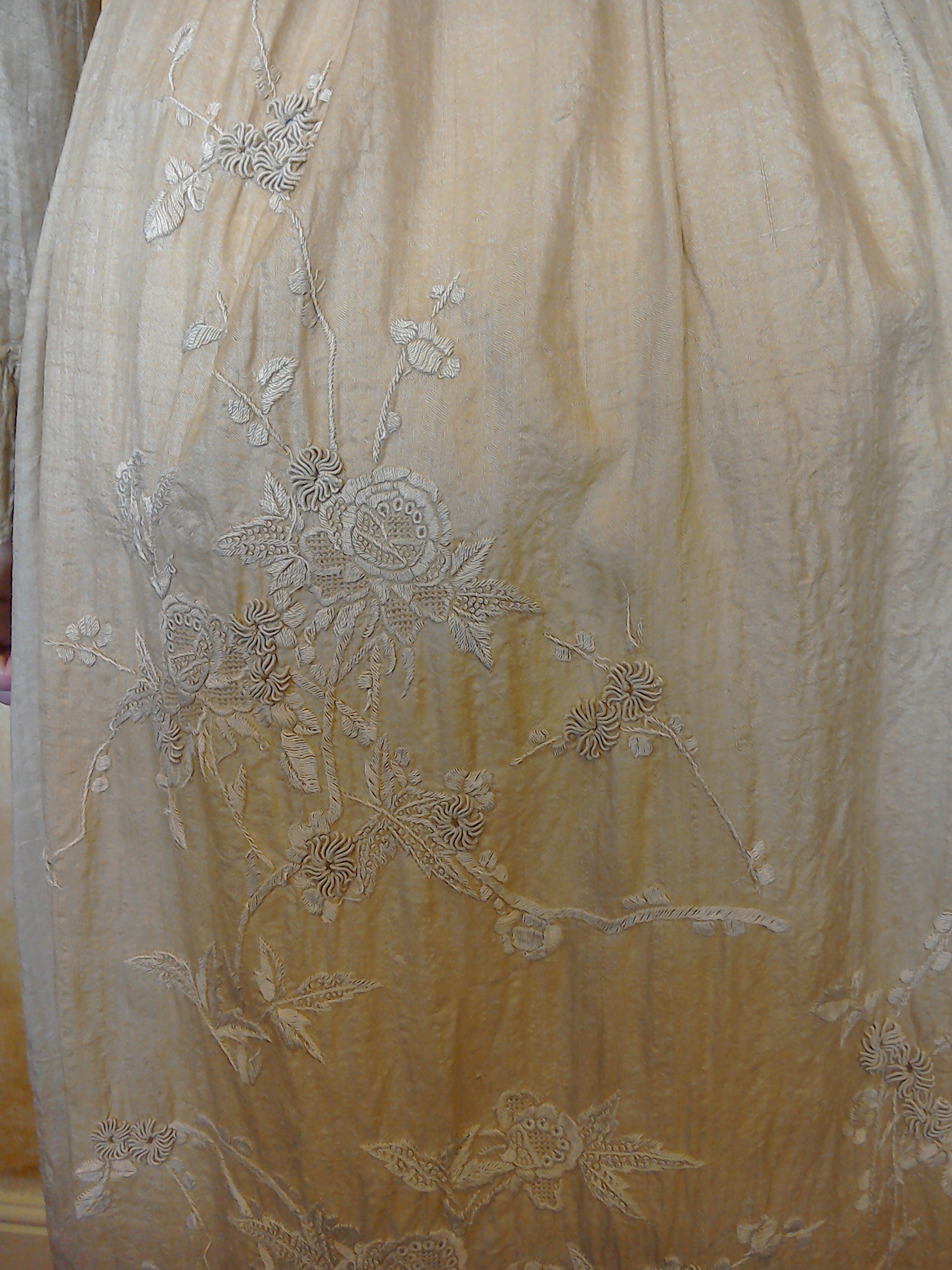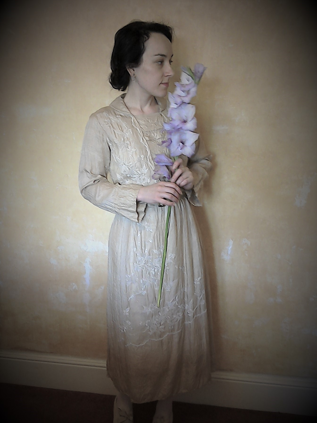This beautiful, delicate dress was entrusted to me by one of my friends. It belonged to a relative who wore it during the period, probably, 1910’s – notice the looser fit, the belt at the natural waist, shin length.