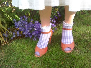 Frilly lilac ankle socks with coral peep toe heels
