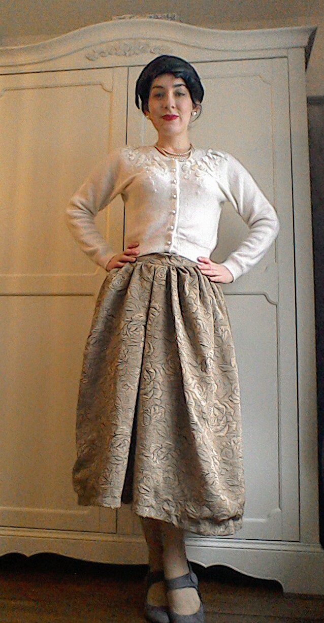Vintage pearl necklace and embellished cardigan fifties feather hat Posted on 24/01/201719/07/2017 by The Girl