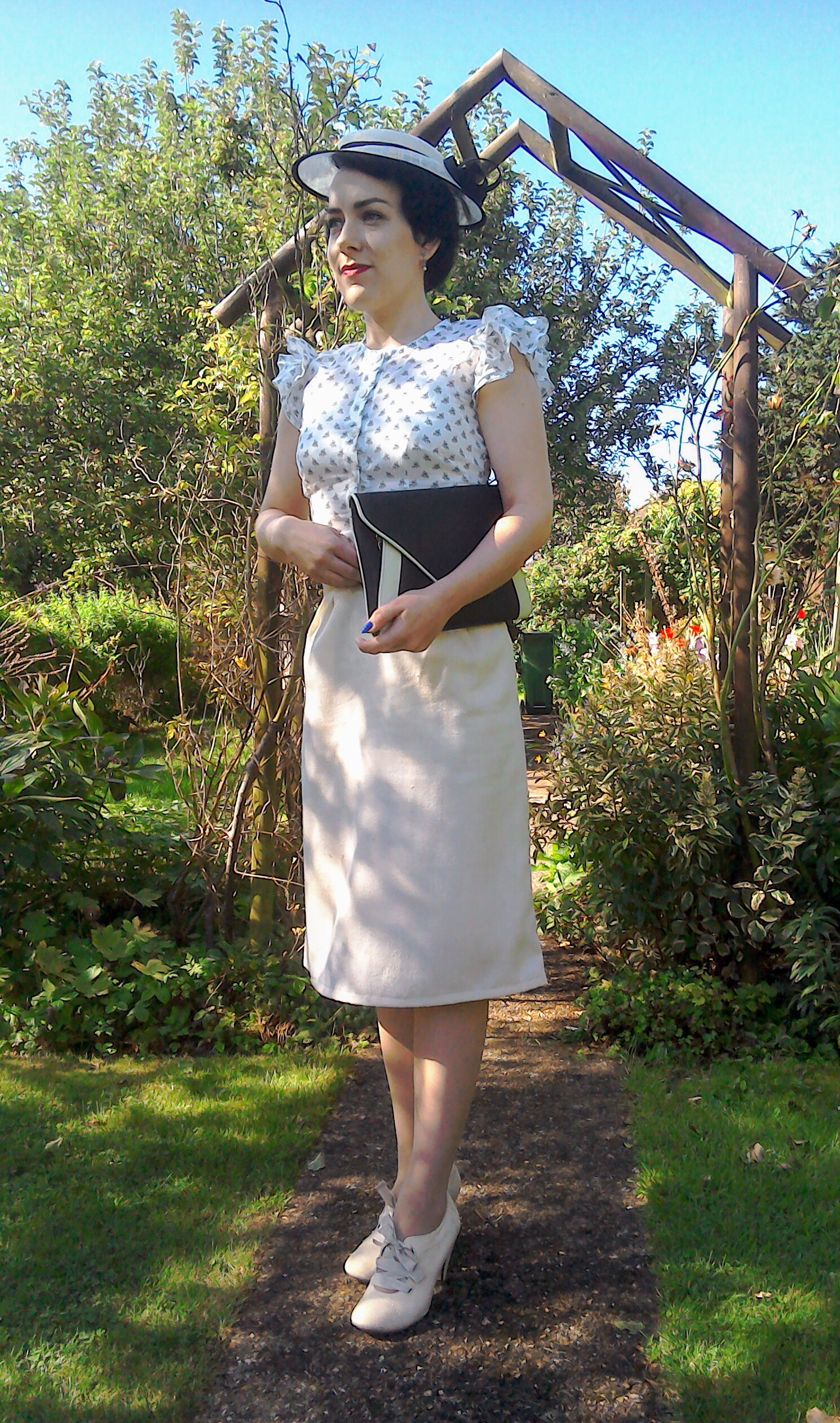 Thirties style summer skirt and frill sleeve blouse worn with black and cream hat Posted on 22/08/201723/08/2017 by The Girl
